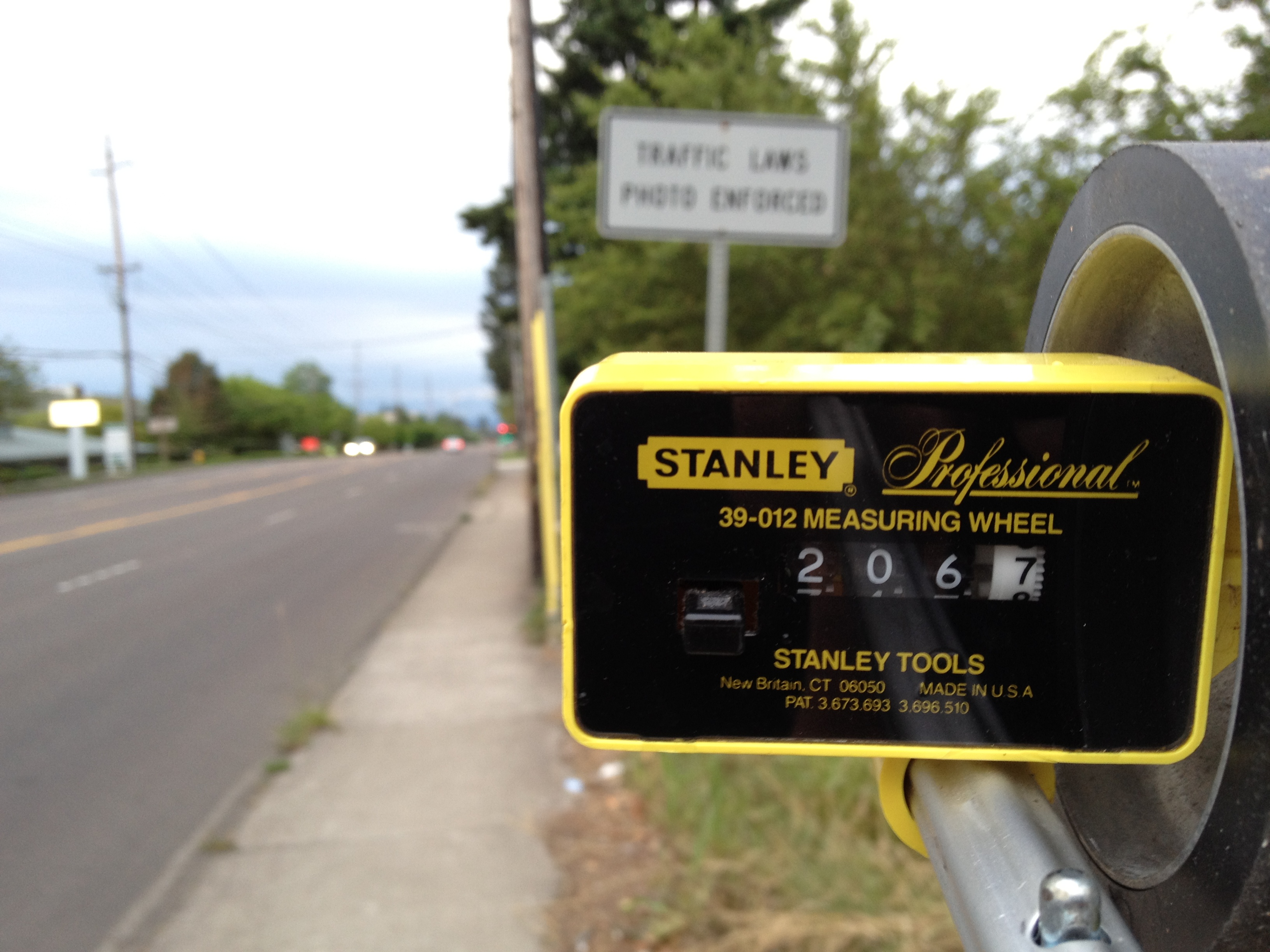 Note about the measuring wheel: it only goes to 999.9 feet then rolls over. What you are seeing is 1206 feet, or 402 yards. This falls outside the allowable distance between sign and van of 100 to 400 yards. (ORSĀ 810.438.B)